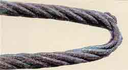| 断線 | 全長、全周にわたりきずの有無を点検する。 ある場合は、山切れ谷切れの状況を入念に 調査し、断線本数を数える。 ![]() C:クラウン断線(ロープ外接円と接する部分 「山断線」の断線) N:ニップ断線(ストランド相互が接する部分 「他に断線」の断線) |